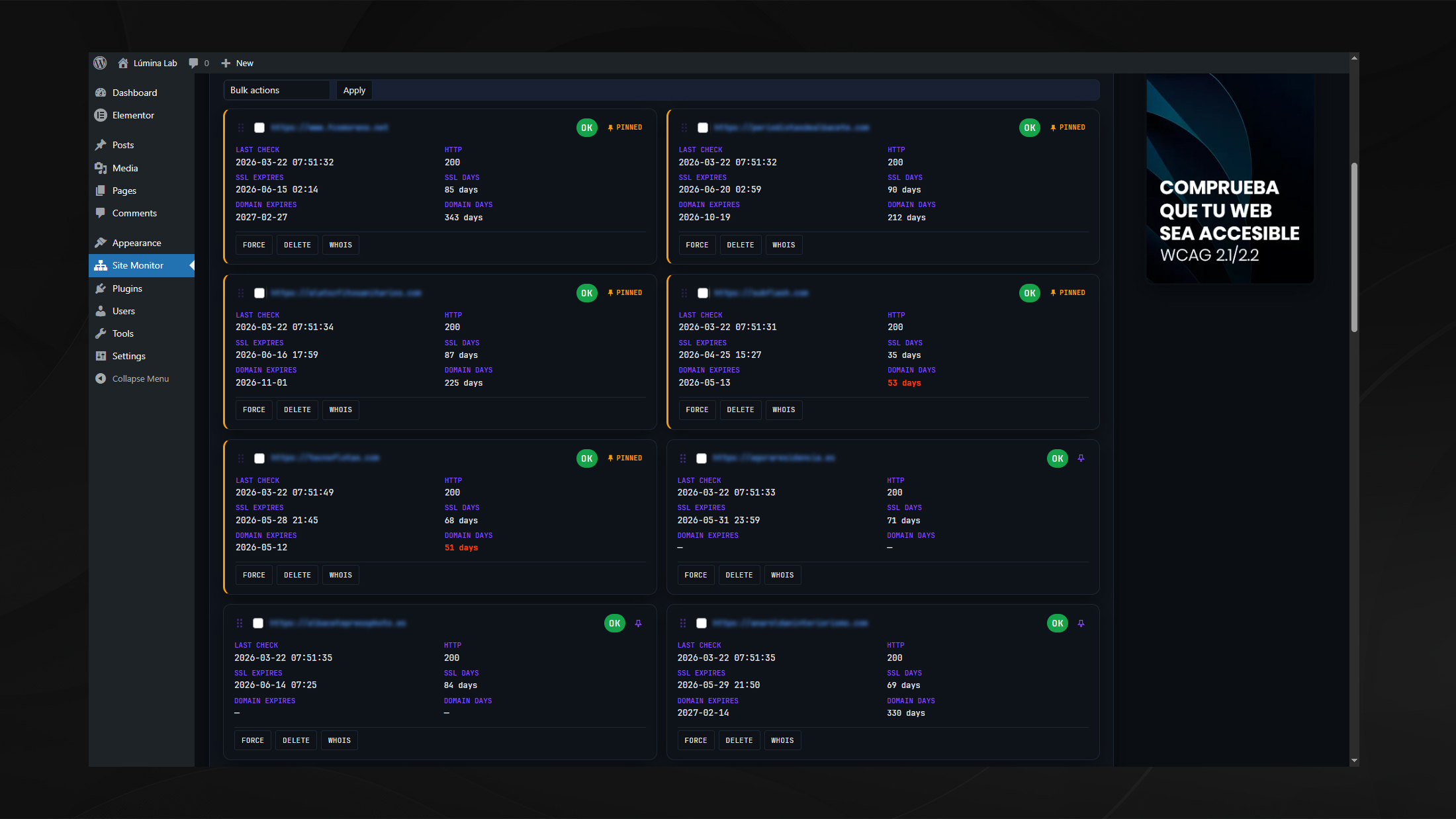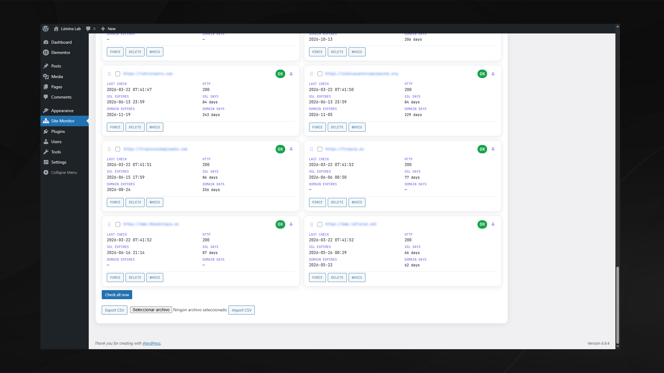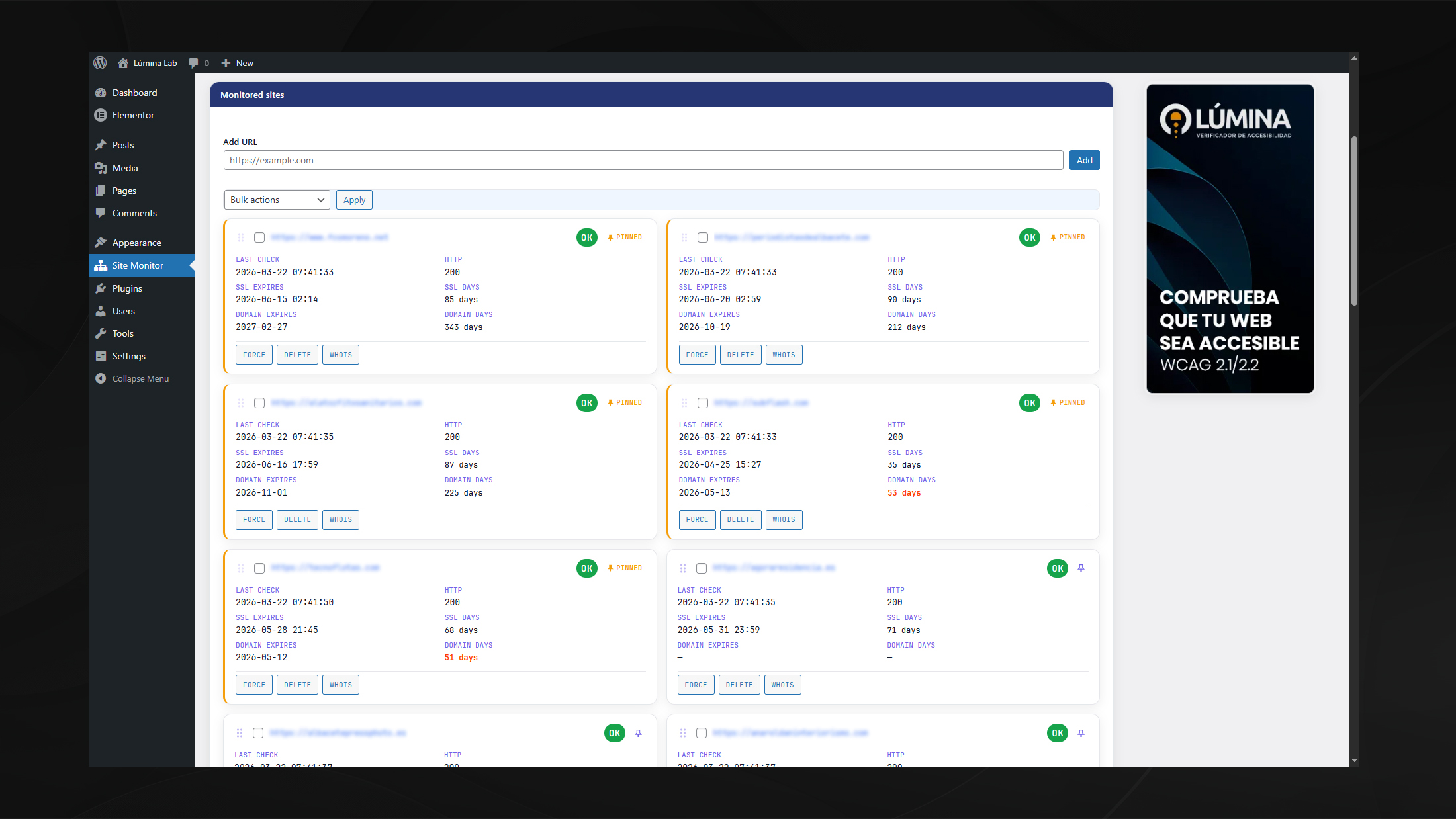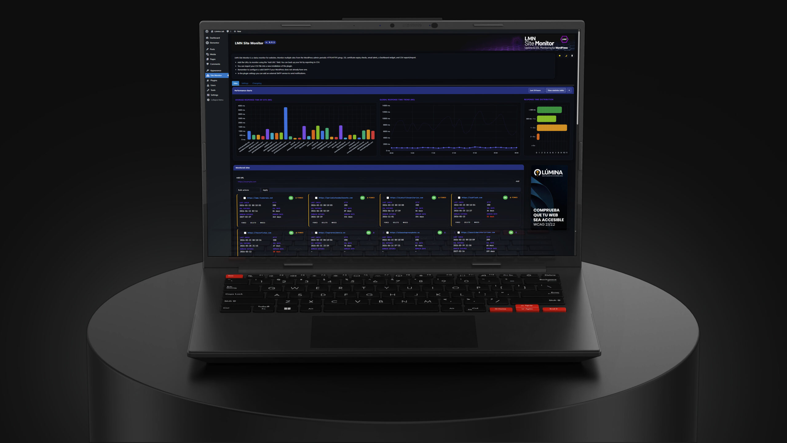 LMN Site Monitor es un plugin para WordPress que permite monitorizar el estado de otros sitios web directamente desde el panel de administración. Comprueba el estado de los sitios mediante pings HTTP/HTTPS en intervalos configurables y verifica la validez del certificado SSL, mostrando los días restantes hasta su caducidad. Permite configurar alertas por correo electrónico cuando un sitio está caído, con opción de establecer el intervalo de reenvío, y es compatible con servidores SMTP externos como Office365 o Gmail. Además, ofrece funciones de importación y exportación en formato CSV, lo que facilita migrar la configuración entre diferentes instalaciones.