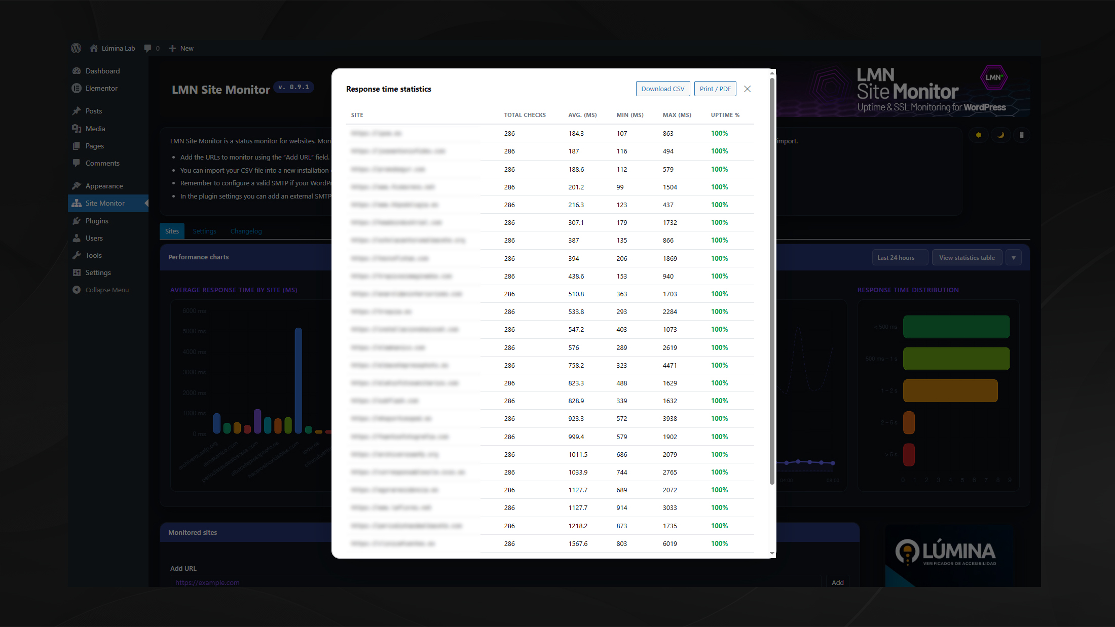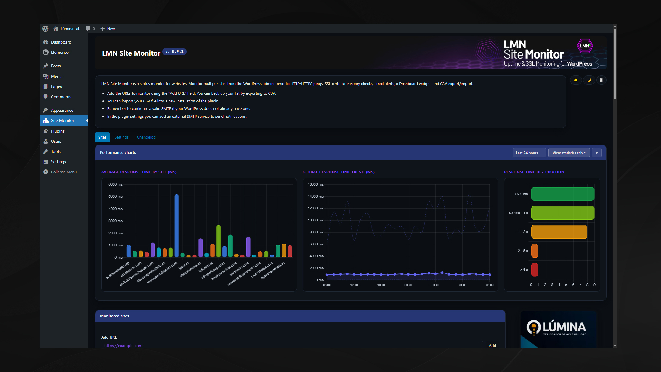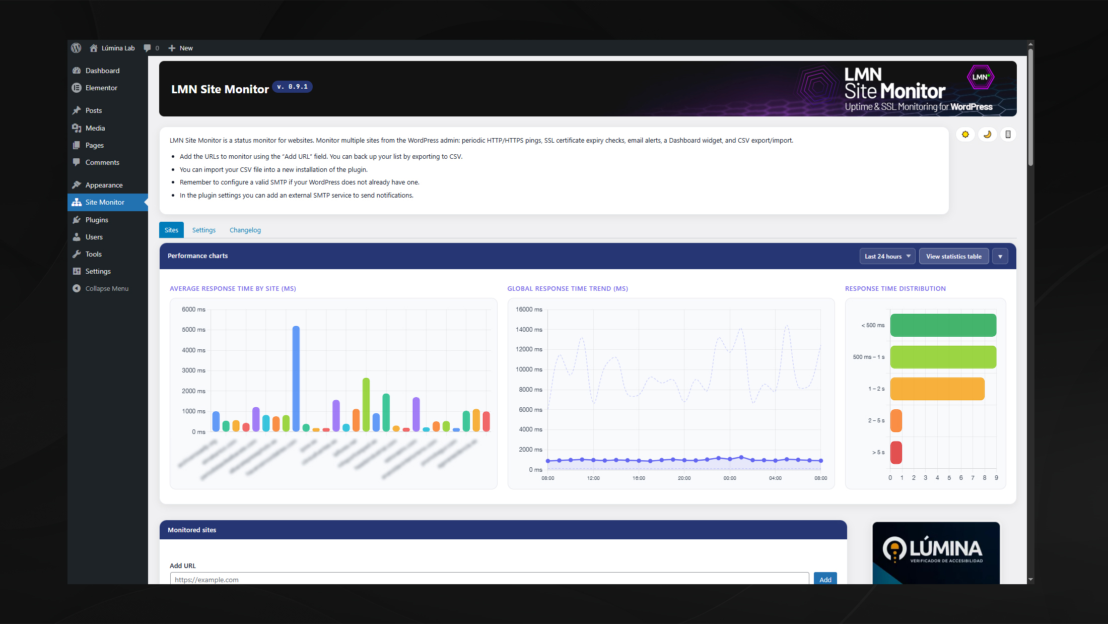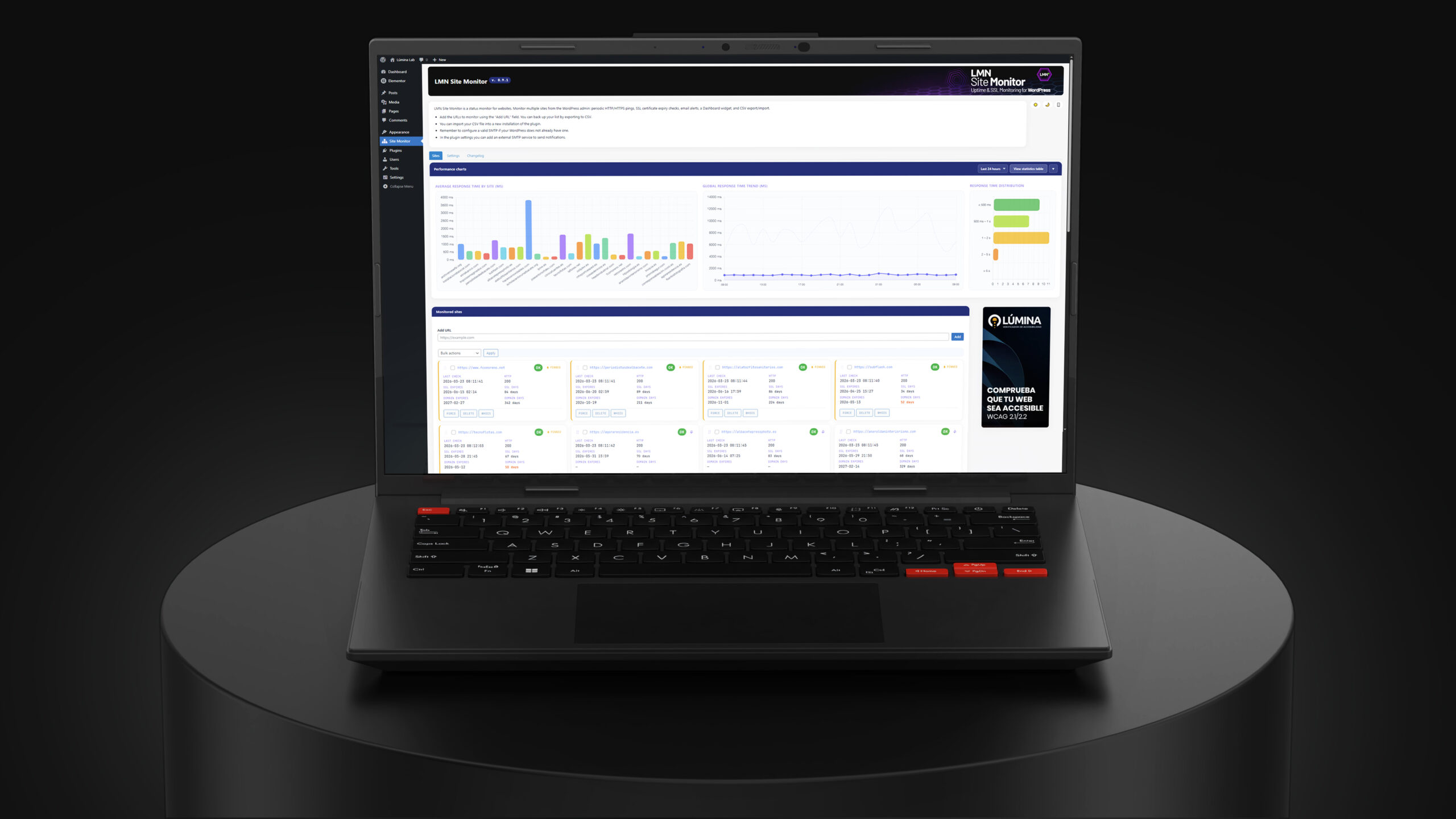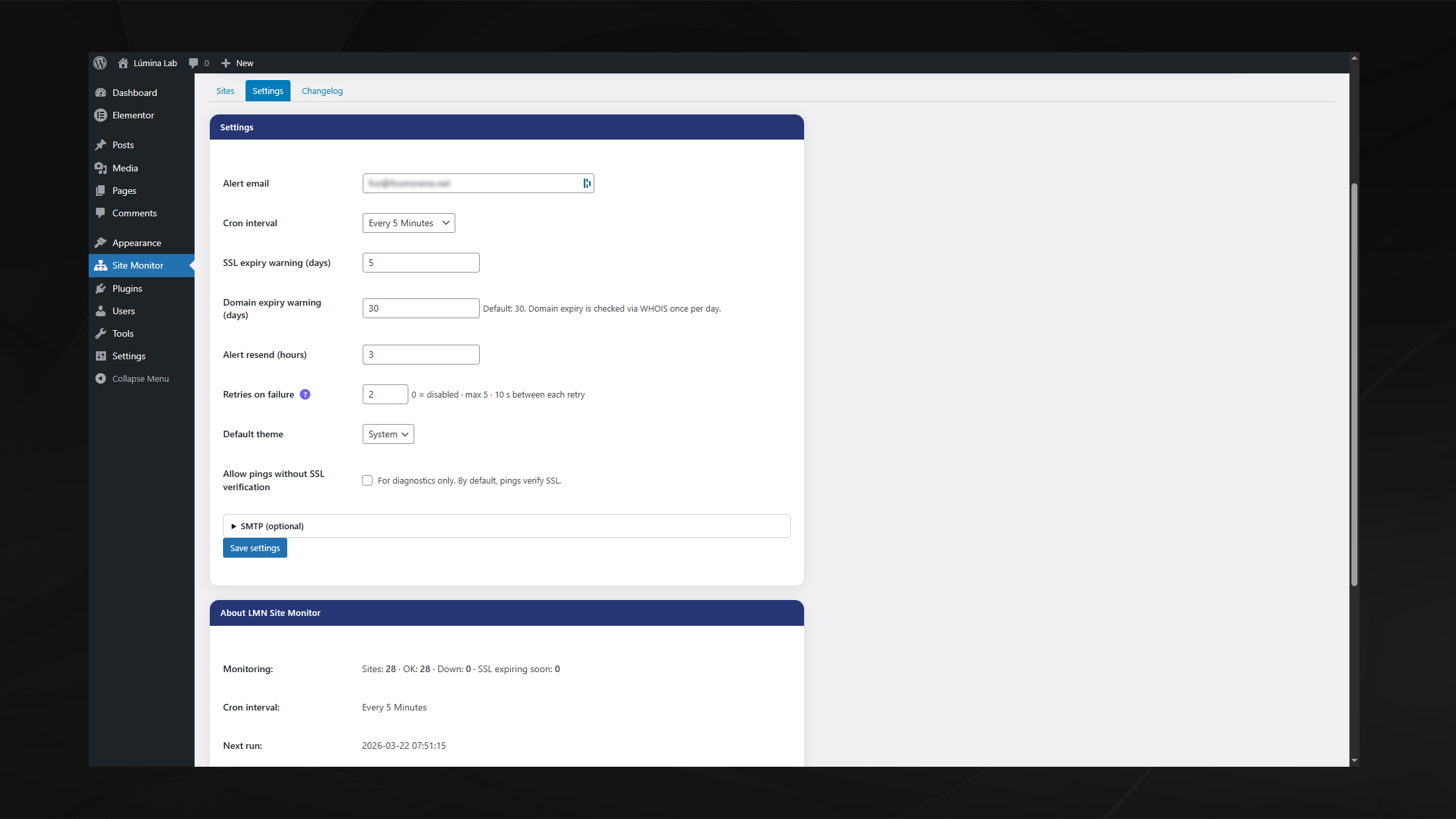 LMN Site Monitor es un plugin para WordPress que permite monitorizar el estado de otros sitios web directamente desde el panel de administración. Comprueba el estado de los sitios mediante pings HTTP/HTTPS en intervalos configurables y verifica la validez del certificado SSL, mostrando los días restantes hasta su caducidad. Permite configurar alertas por correo electrónico cuando un sitio está caído, con opción de establecer el intervalo de reenvío, y es compatible con servidores SMTP externos como Office365 o Gmail. Además, ofrece funciones de importación y exportación en formato CSV, lo que facilita migrar la configuración entre diferentes instalaciones.