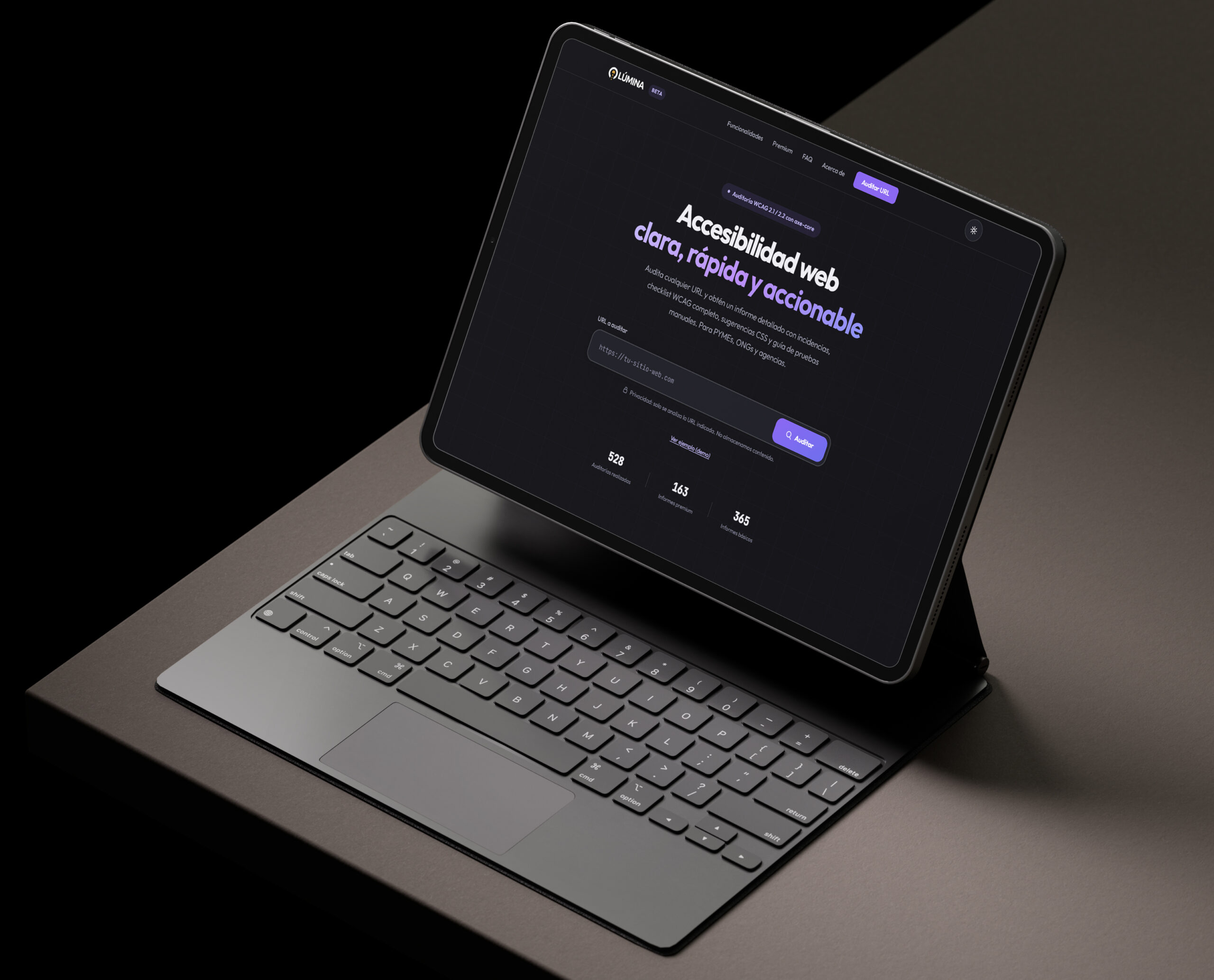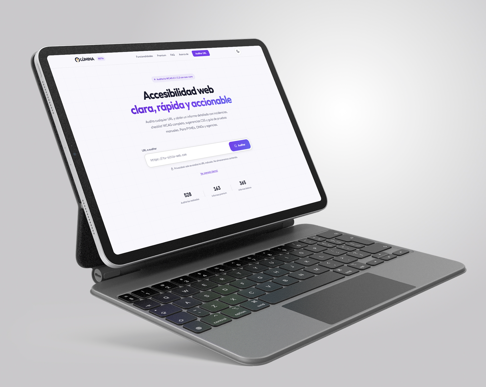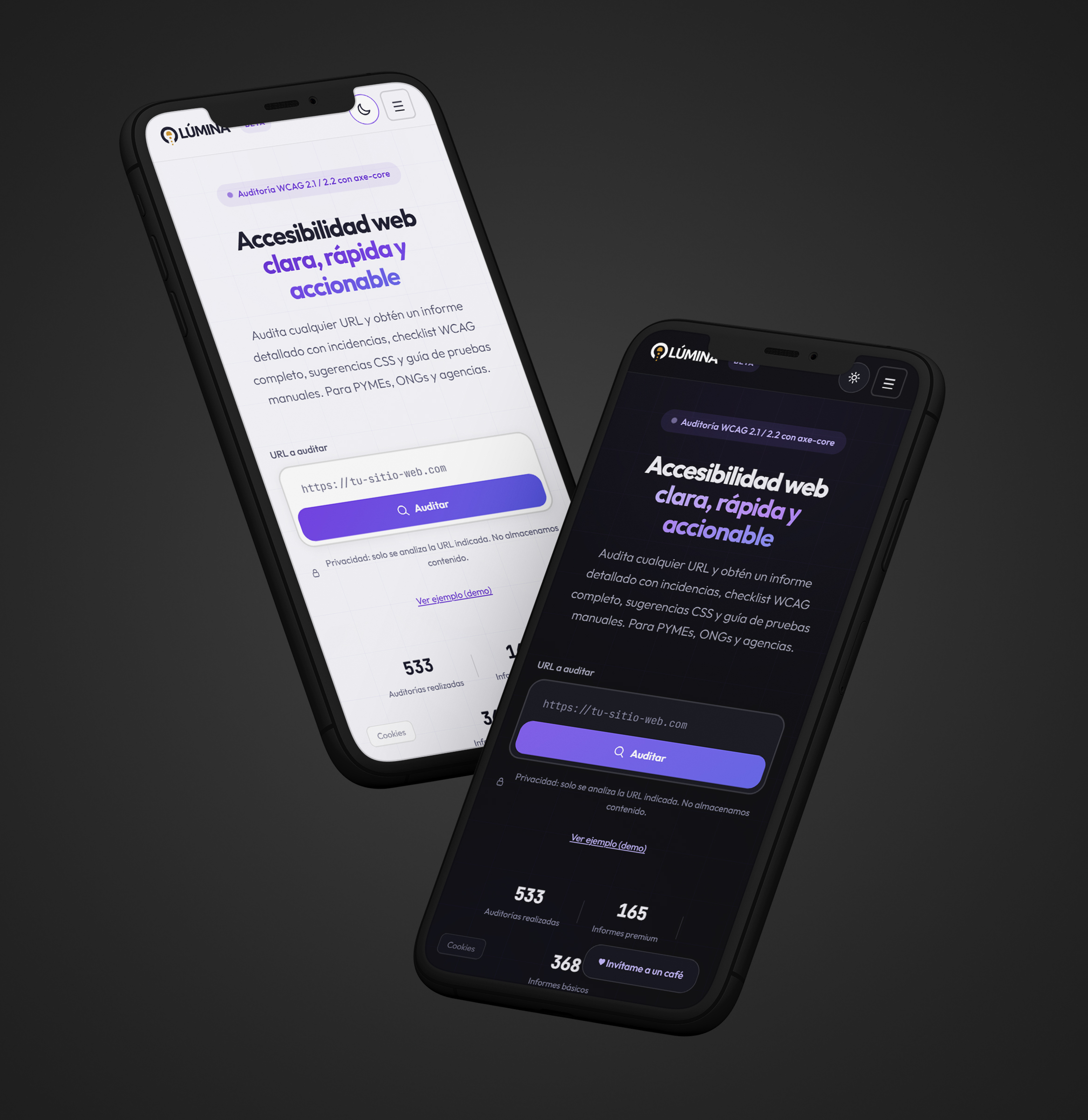 Lúmina es un micro-SaaS diseñado y elaborado para realizar auditorías rápidas de accesibilidad web. Está pensado especialmente para ayuntamientos, ONGs, pymes y pequeñas agencias que quieren mejorar la inclusión digital sin complicaciones. Se trata de una herramienta de validación de accesibilidad web, y ayuda a verificar que un sitio cumple con las Pautas de Accesibilidad al Contenido en la Web (Web Content Accessibility Guidelines) WCAG. En el Verificador de Accesibilidad Lúmina, he querido cubrir la validación de todos criterios WCAG 2.1/2.2 para páginas web creando un herramienta online a la que se le pasa la URL de la página a auditar y generando un informe gratuito que evalúa la accesibilidad del sitio; y utilizando como base aXe, una herramienta para desarrolladores que proporciona información detallada sobre los errores y documentación para solucionarlos.