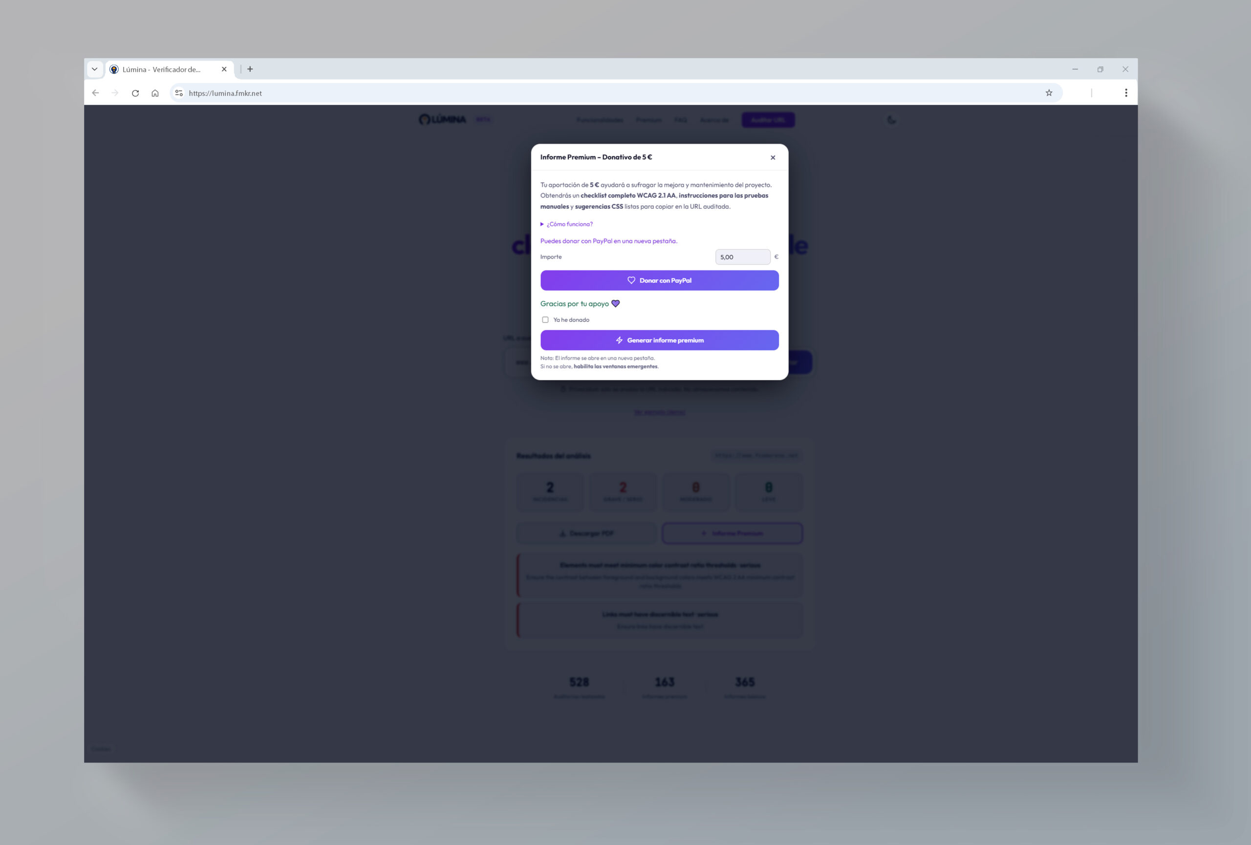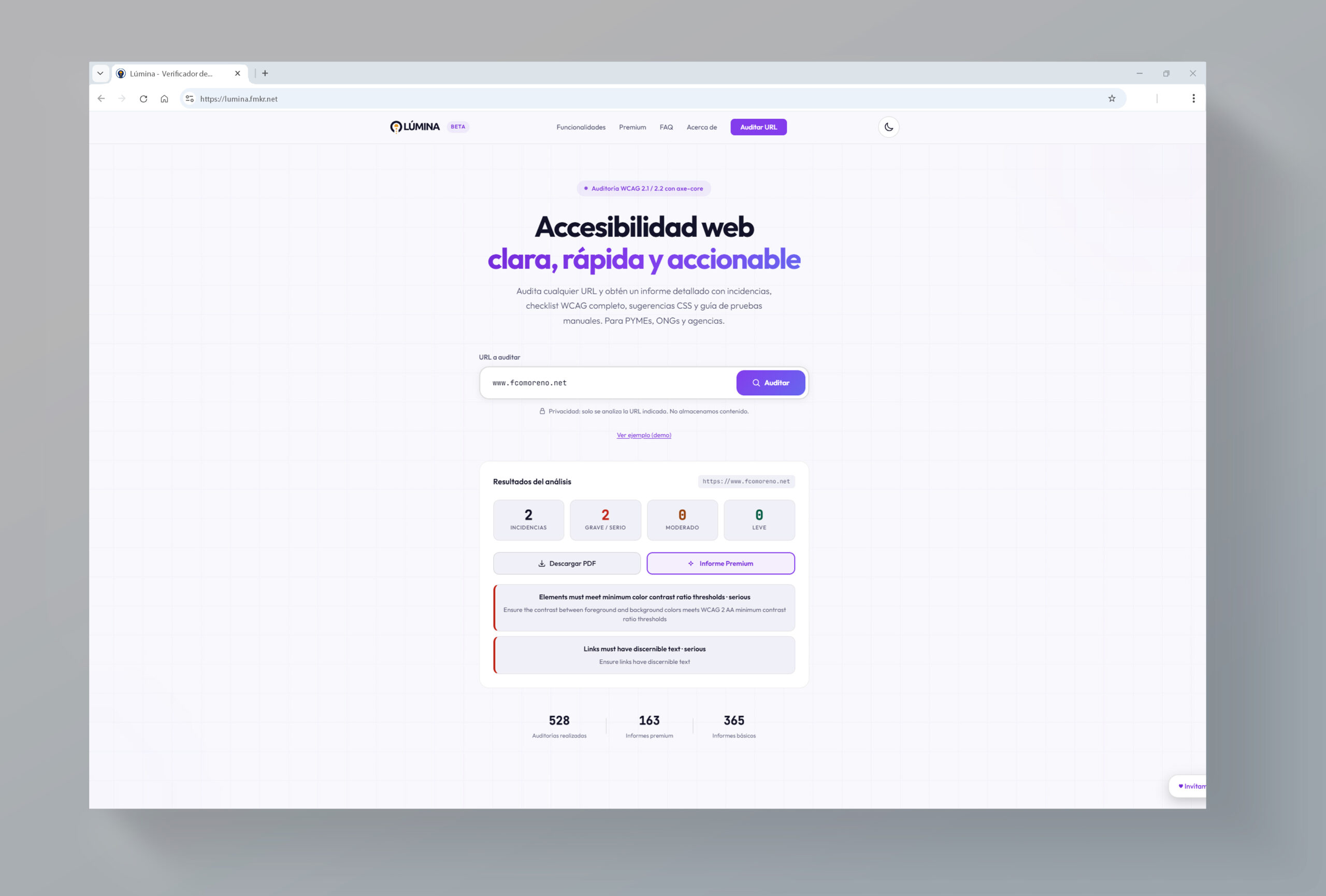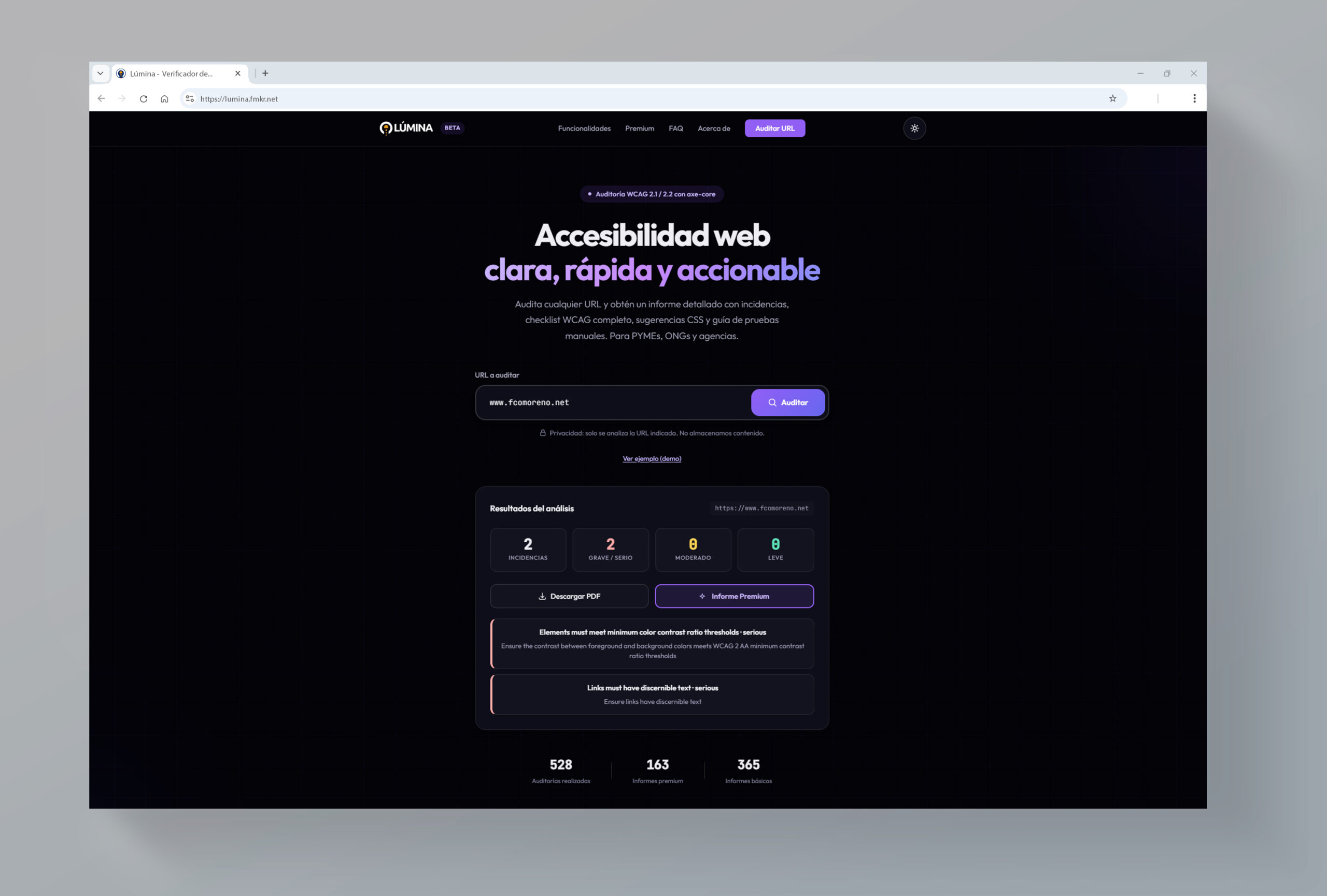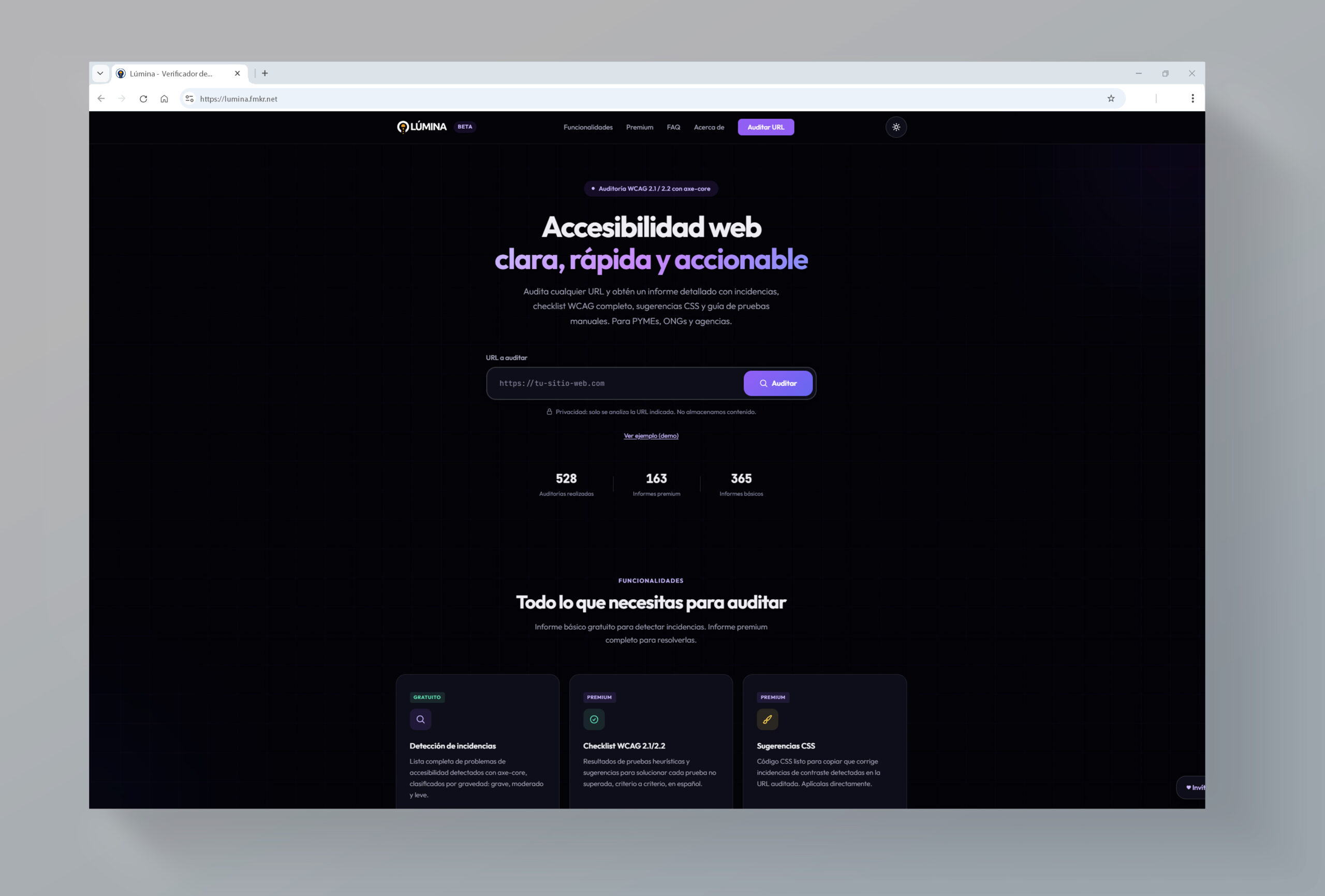 Lúmina es un micro-SaaS diseñado y elaborado para realizar auditorías rápidas de accesibilidad web. Está pensado especialmente para ayuntamientos, ONGs, pymes y pequeñas agencias que quieren mejorar la inclusión digital sin complicaciones. Se trata de una herramienta de validación de accesibilidad web, y ayuda a verificar que un sitio cumple con las Pautas de Accesibilidad al Contenido en la Web (Web Content Accessibility Guidelines) WCAG. En el Verificador de Accesibilidad Lúmina, he querido cubrir la validación de todos criterios WCAG 2.1/2.2 para páginas web creando un herramienta online a la que se le pasa la URL de la página a auditar y generando un informe gratuito que evalúa la accesibilidad del sitio; y utilizando como base aXe, una herramienta para desarrolladores que proporciona información detallada sobre los errores y documentación para solucionarlos.