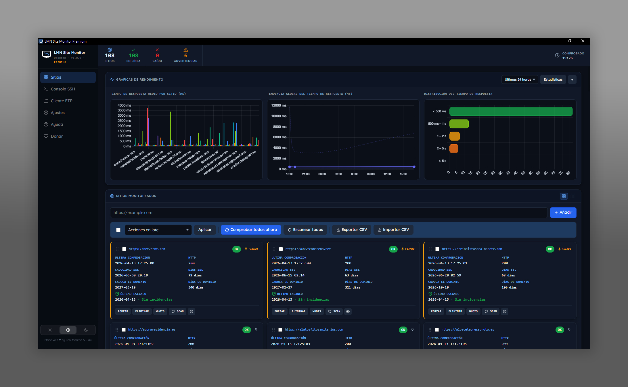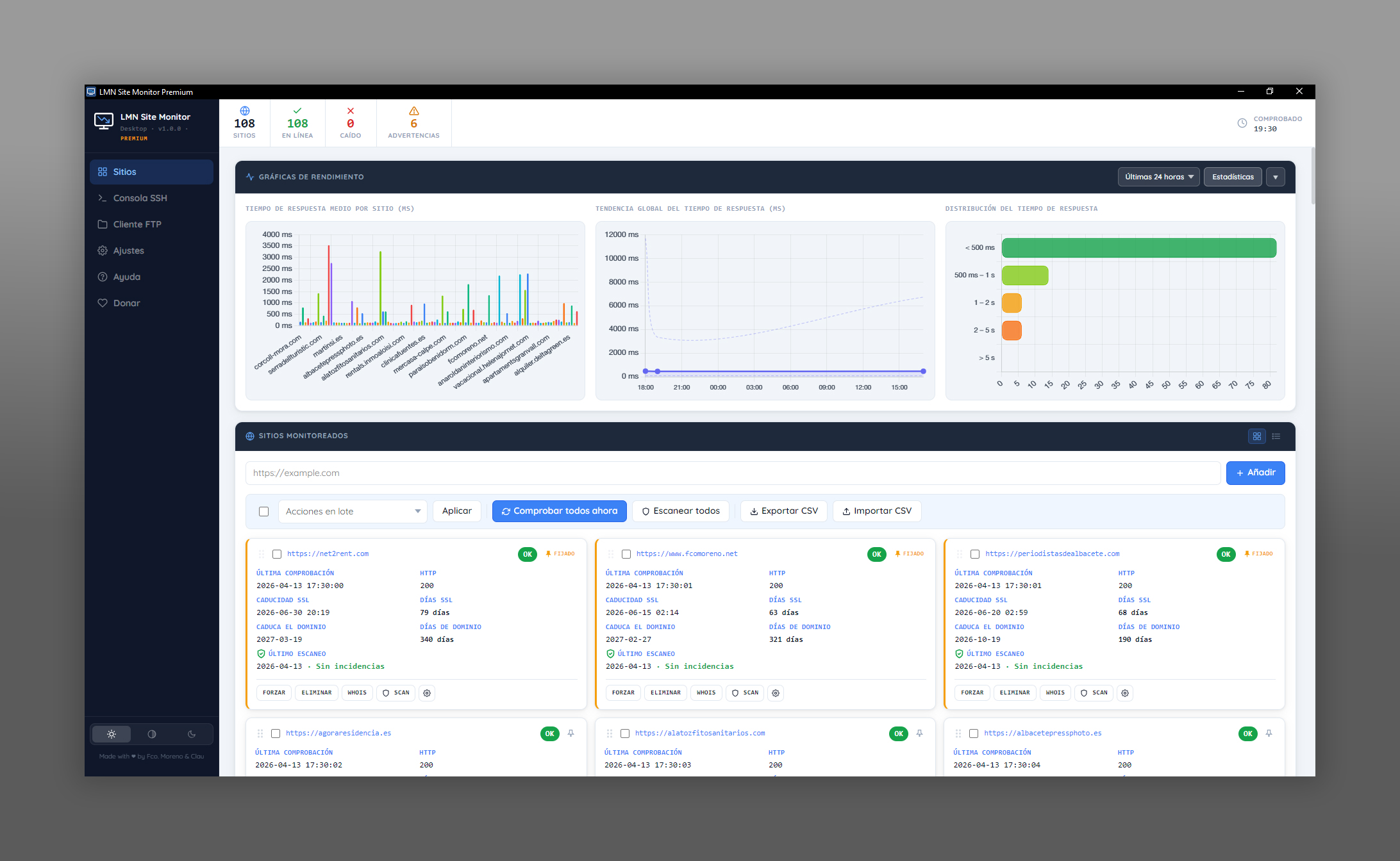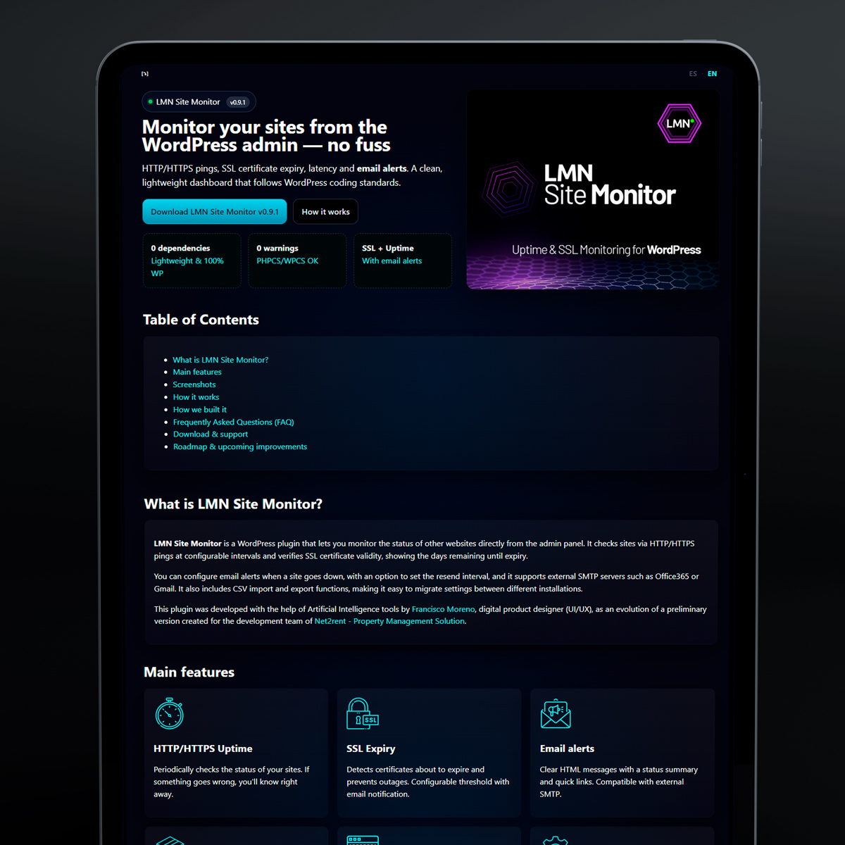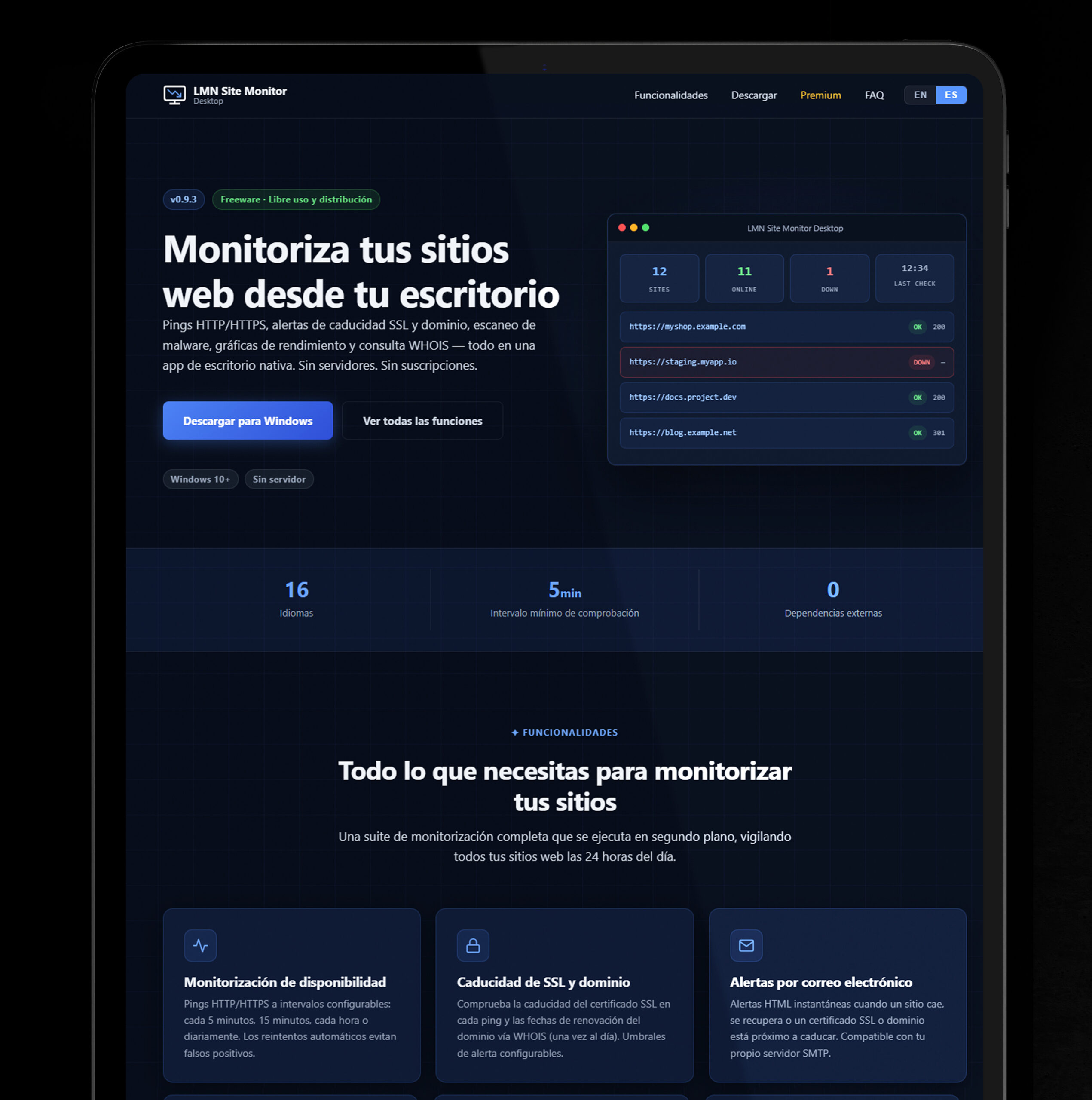 Site Monitor Desktop es una aplicación de escritorio ligera que te permite monitorizar el estado de tus sitios web, sus certificados SSL y otros parámetros básicos directamente desde tu ordenador. La idea es la misma filosofía que ya sigo en LMN Site Monitor (el plugin de WordPress): enfocarse en lo esencial, con una interfaz clara y sin capas de complejidad innecesarias. En lugar de conectarte a una plataforma en la nube, la propia app realiza las comprobaciones y te muestra en tiempo real qué sitios están online, cuáles responden lento y cuándo toca revisar certificados o dominios.  Si ya conoces LMN Site Monitor, mi plugin de monitorización para WordPress, verás que comparten filosofía y parte del ADN. LMN Site Monitor te permite controlar el estado de tus sitios directamente desde el dashboard de WordPress, mientras que LMN Site Monitor Desktop lleva esa idea al escritorio, sin necesidad de entrar en ninguna administración.