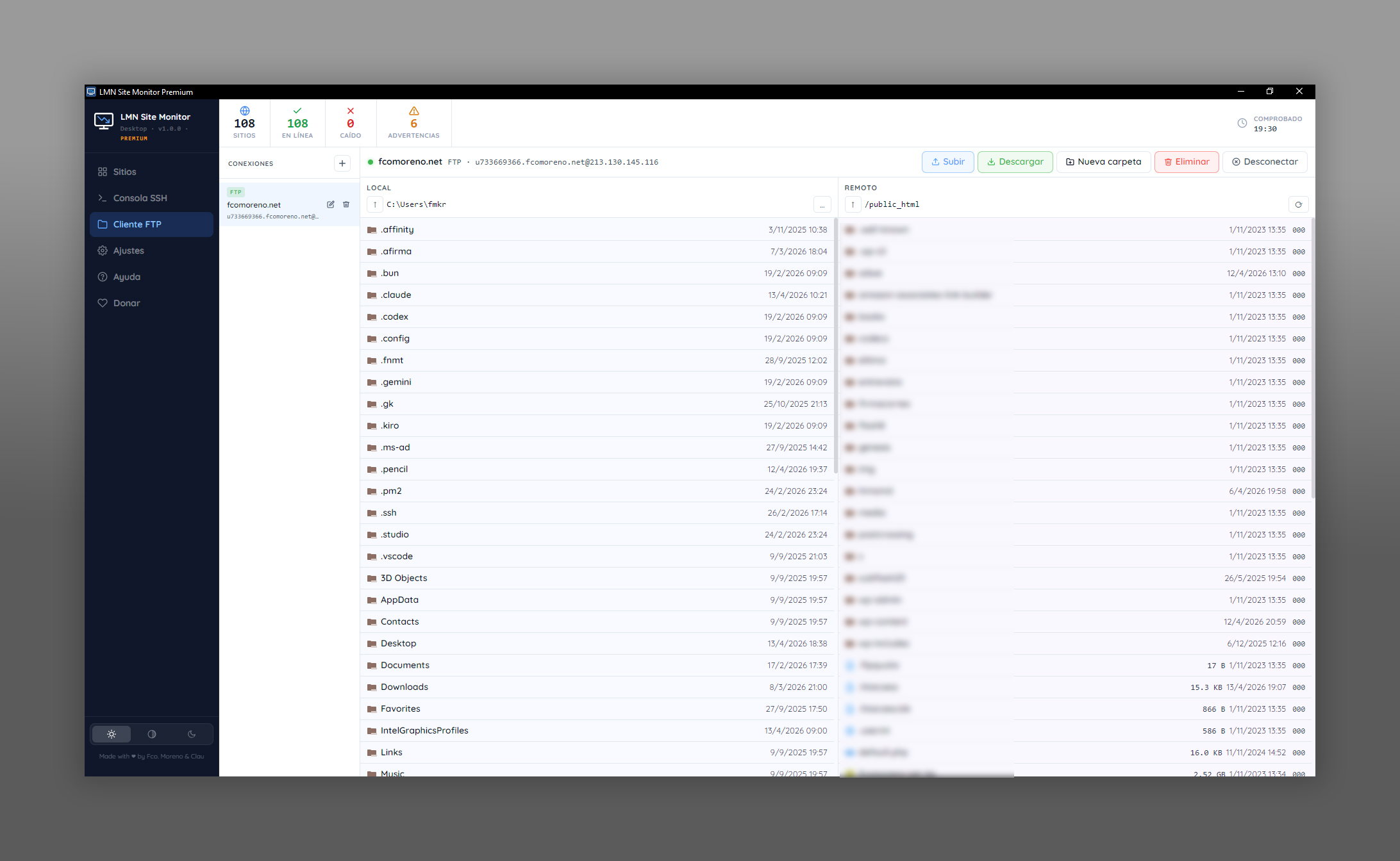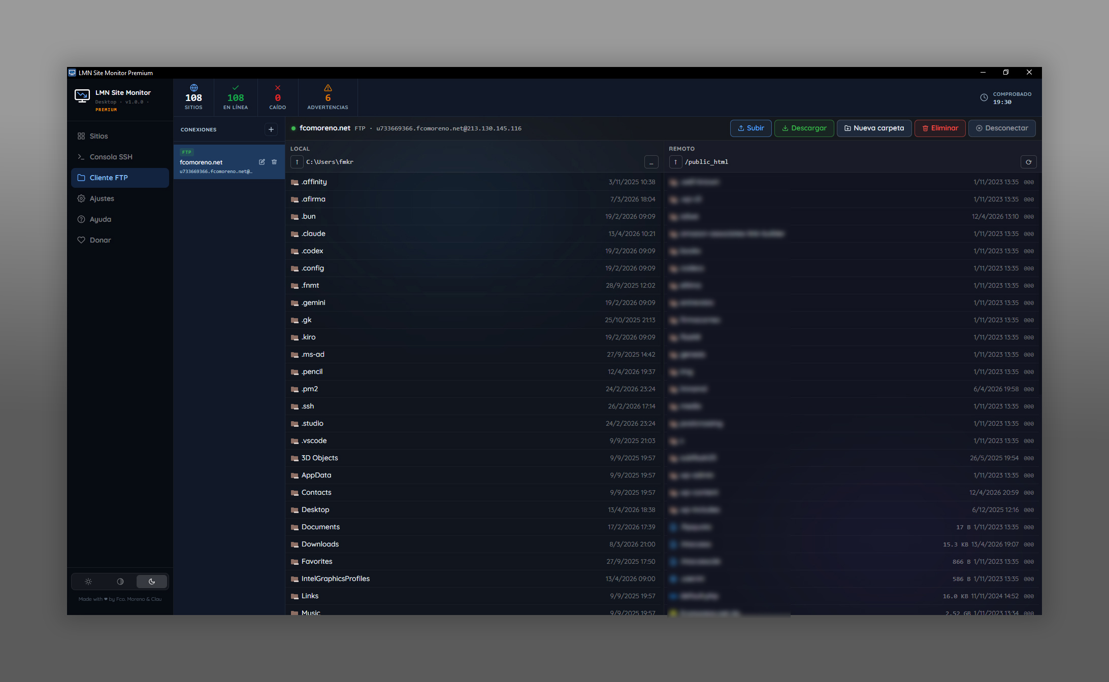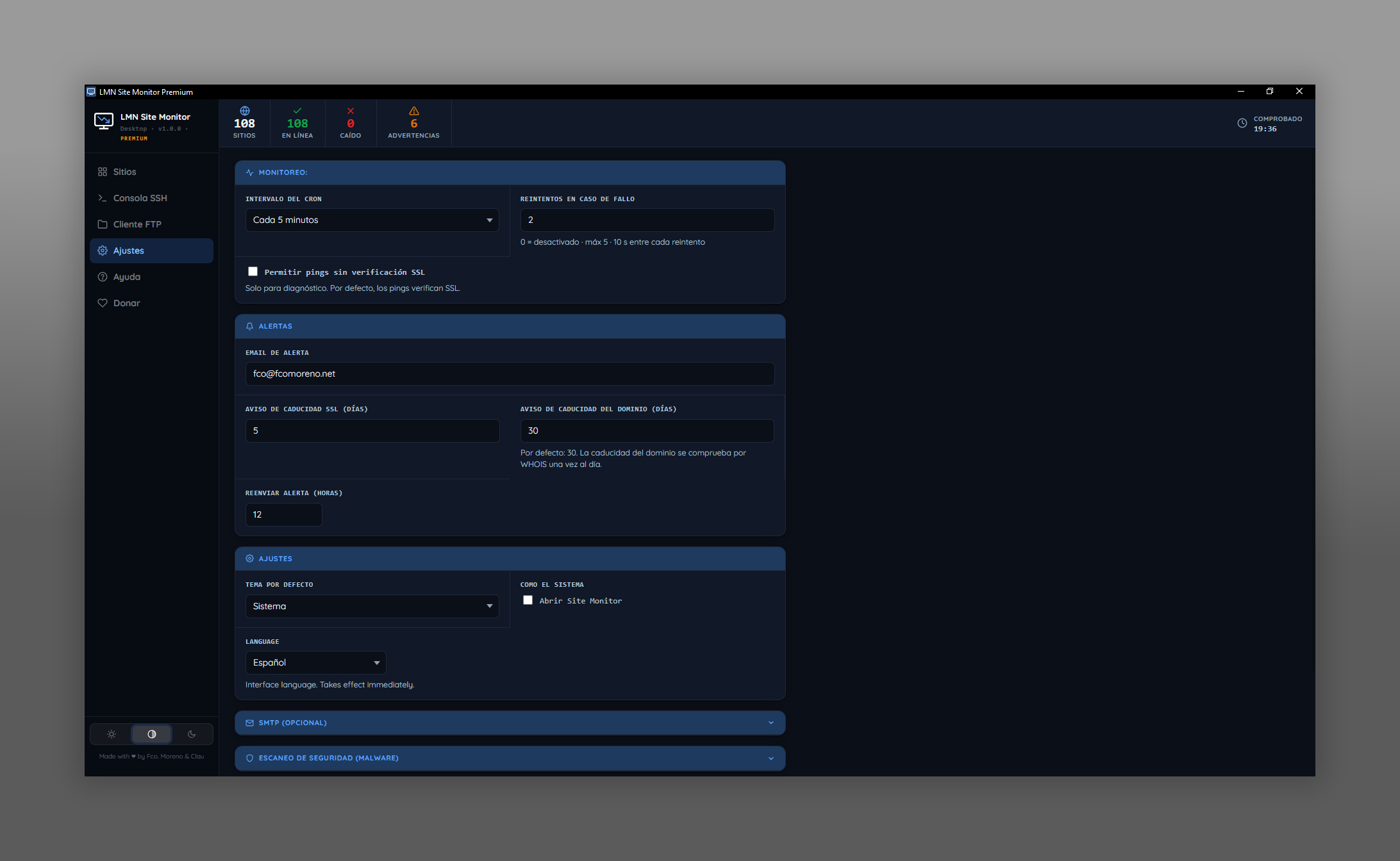 Site Monitor Desktop es una aplicación de escritorio ligera que te permite monitorizar el estado de tus sitios web, sus certificados SSL y otros parámetros básicos directamente desde tu ordenador. La idea es la misma filosofía que ya sigo en LMN Site Monitor (el plugin de WordPress): enfocarse en lo esencial, con una interfaz clara y sin capas de complejidad innecesarias. En lugar de conectarte a una plataforma en la nube, la propia app realiza las comprobaciones y te muestra en tiempo real qué sitios están online, cuáles responden lento y cuándo toca revisar certificados o dominios.  Si ya conoces LMN Site Monitor, mi plugin de monitorización para WordPress, verás que comparten filosofía y parte del ADN. LMN Site Monitor te permite controlar el estado de tus sitios directamente desde el dashboard de WordPress, mientras que LMN Site Monitor Desktop lleva esa idea al escritorio, sin necesidad de entrar en ninguna administración.