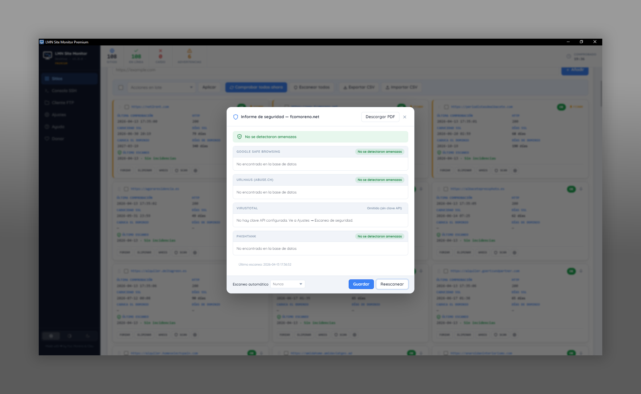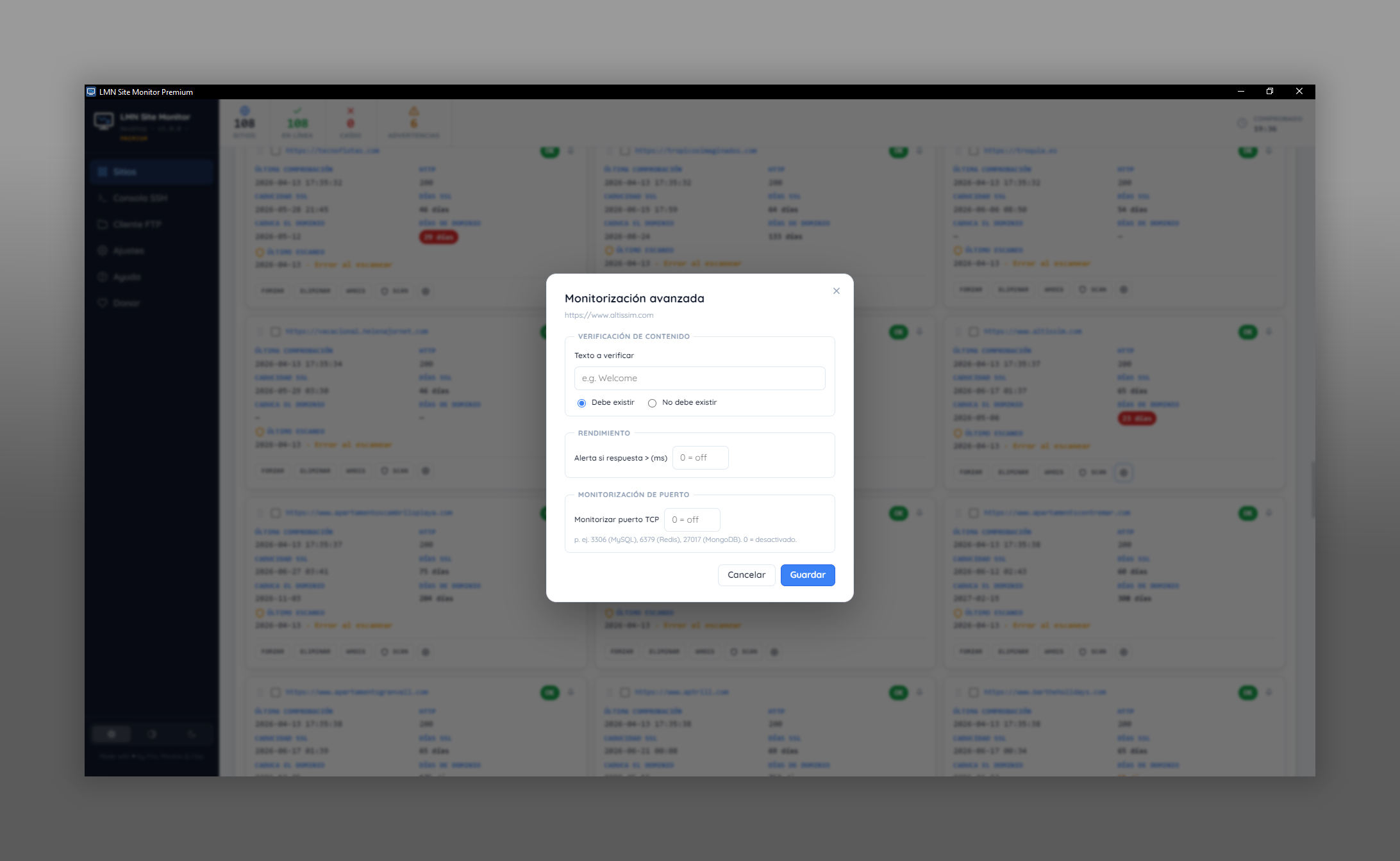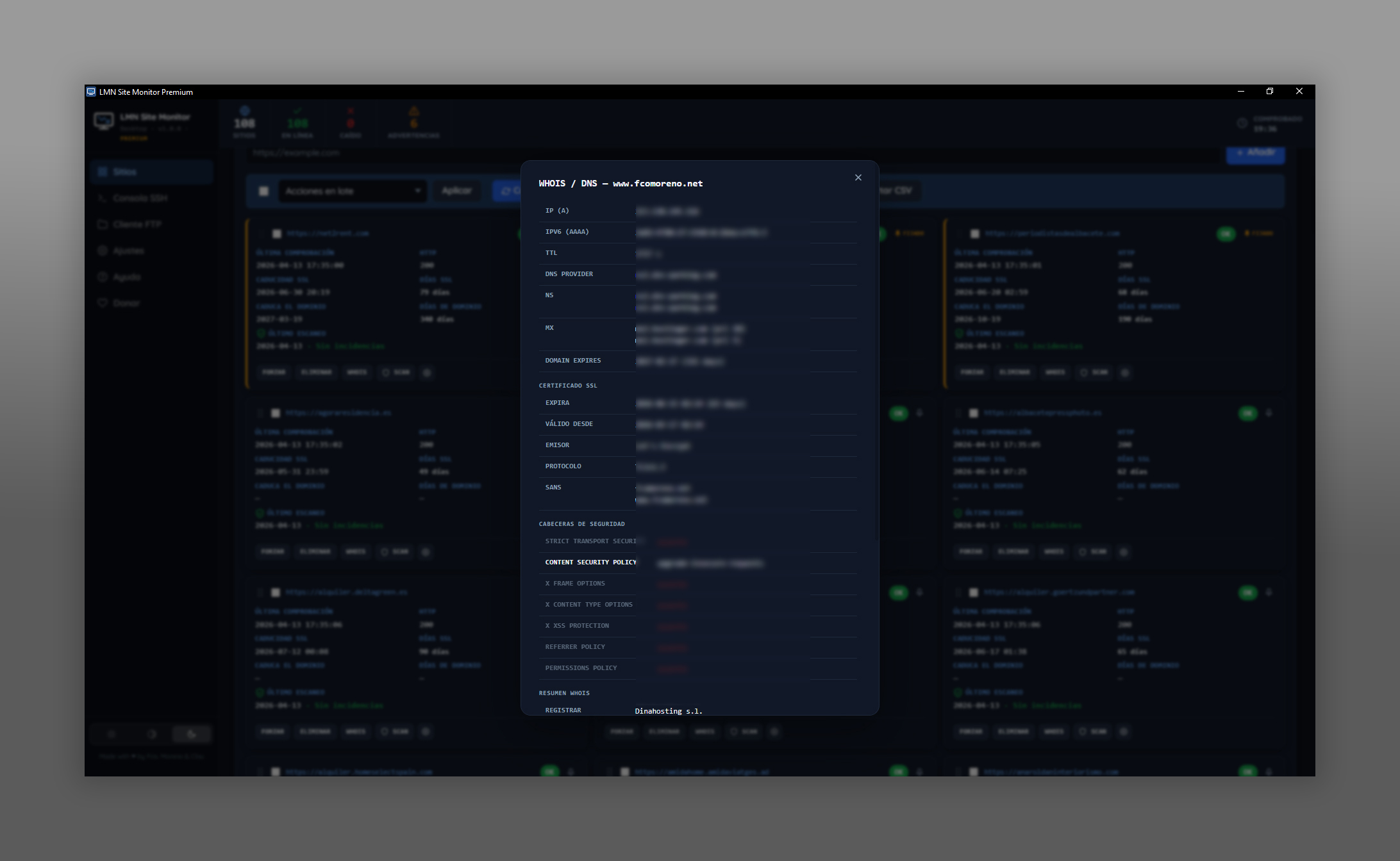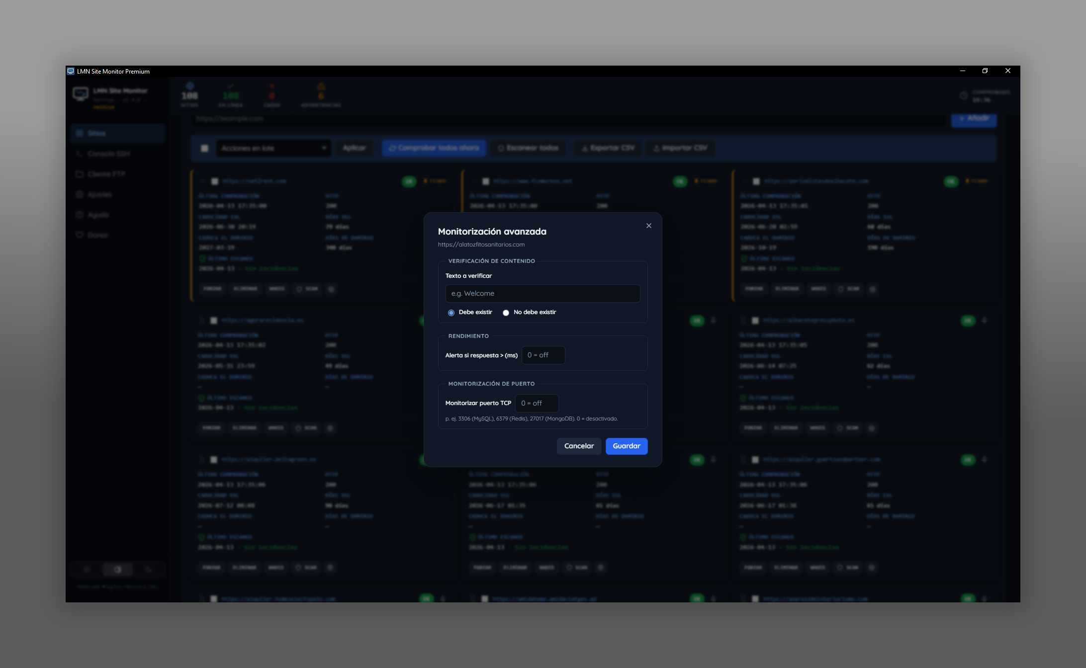 Site Monitor Desktop es una aplicación de escritorio ligera que te permite monitorizar el estado de tus sitios web, sus certificados SSL y otros parámetros básicos directamente desde tu ordenador. La idea es la misma filosofía que ya sigo en LMN Site Monitor (el plugin de WordPress): enfocarse en lo esencial, con una interfaz clara y sin capas de complejidad innecesarias. En lugar de conectarte a una plataforma en la nube, la propia app realiza las comprobaciones y te muestra en tiempo real qué sitios están online, cuáles responden lento y cuándo toca revisar certificados o dominios.  Si ya conoces LMN Site Monitor, mi plugin de monitorización para WordPress, verás que comparten filosofía y parte del ADN. LMN Site Monitor te permite controlar el estado de tus sitios directamente desde el dashboard de WordPress, mientras que LMN Site Monitor Desktop lleva esa idea al escritorio, sin necesidad de entrar en ninguna administración.