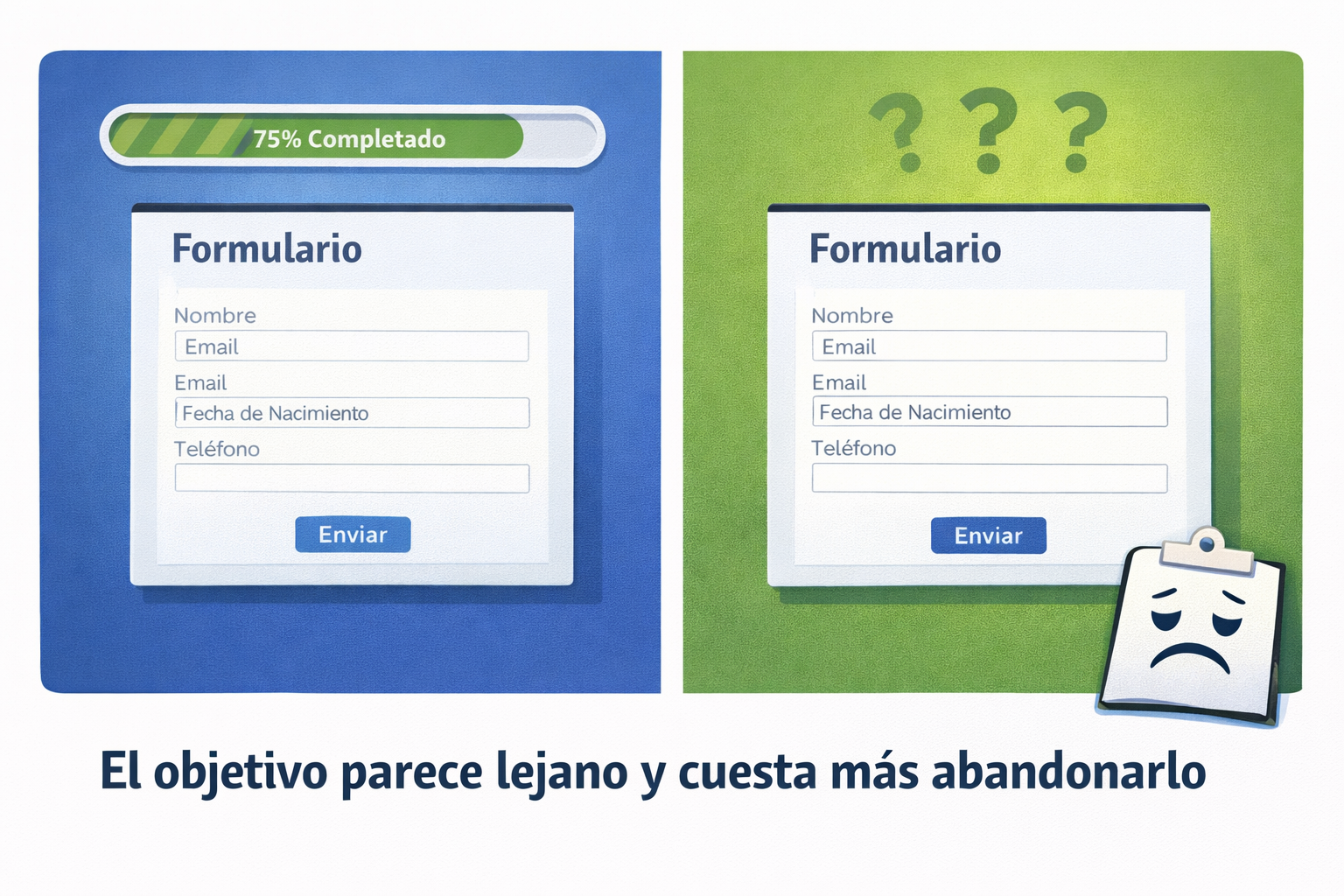 El primero es el Efecto Zeigarnik, que es esa pequeña obsesión que nos genera lo que nos dejamos a medias. Al cerebro humano le horrorizan los cabos sueltos; por eso, una simple barra de progreso es oro puro. Ver un «75% completado» genera una tensión que solo se alivia terminando la tarea. Úsalo a tu favor: si quieres que alguien rellene un formulario tedioso, enséñale lo poco que le falta para terminar y cruzar la meta.